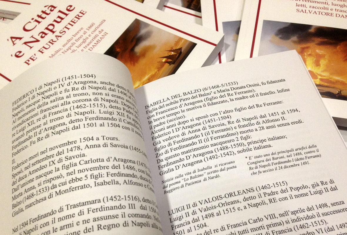 pubblicità Da anni ci occupiamo di pubblicità. Vantiamo ottimi partner e ci occupiamo di tutte le attività indispensabili a creare messaggi mirati. Home Servizi Portfolio 2019 – Molto, molto breve storia di Napoli fino al 1860 con avvenimenti, luoghi e curiosità letti, raccolti e trascritti da Salvatore Damiani.